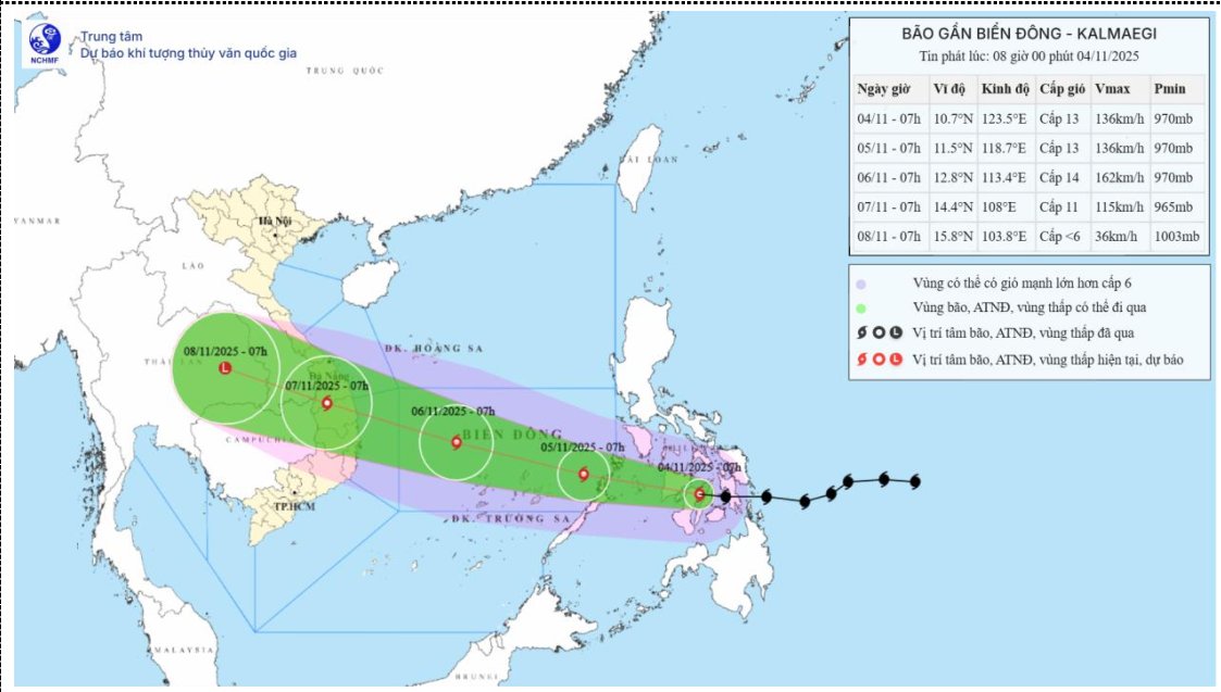 Đáng chú ý, đến 7 giờ ngày 7/11, tâm bão được dự báo sẽ ở trên đất liền các tỉnh từ Quảng Ngãi đến Đắk Lắk, sức gió mạnh cấp 10-11, giật cấp 13, sau đó suy yếu dần. Phạm vi ảnh hưởng rộng, bao trùm khu vực giữa Biển Đông, vùng biển từ Đà Nẵng đến Khánh Hòa (bao gồm đặc khu Lý Sơn) và khu vực đất liền Quảng Ngãi đến Đắk Lắk.