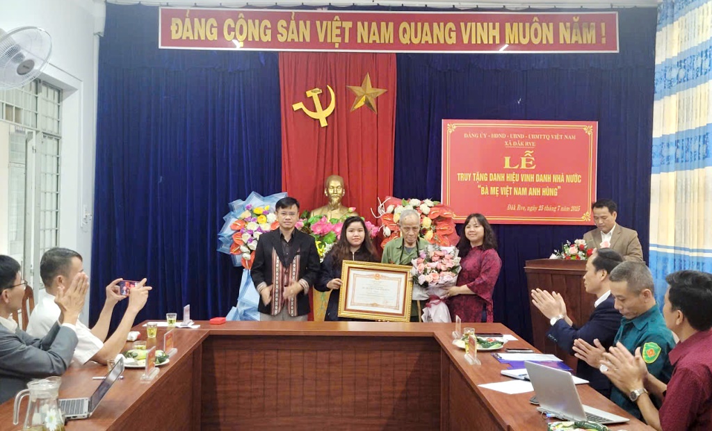 Tại buổi lễ, UBND xã Đăk Rve đã công bố quyết định của Chủ tịch nước và trao tặng danh hiệu vinh dự Nhà nước “Bà mẹ Việt Nam Anh hùng” thân nhân của mẹ Y Pruong.