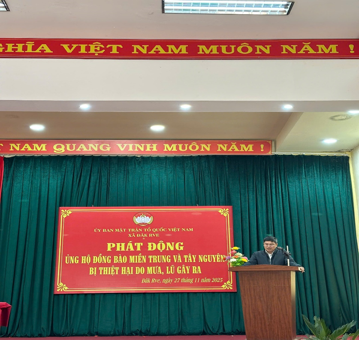 Phát biểu tại lễ phát động đồng chí Trương Thanh Tùng - Bí thư Đảng ủy, Chủ tịch HĐND xã Đăk Rve kêu gọi toàn thể cán bộ, công chức, viên chức và người lao động cùng bà con Nhân dân, phát huy tinh thần “tương thân, tương ái”, “lá lành đùm lá rách”, tích cực ủng hộ đồng bào các địa phương bị ảnh hưởng bởi thiên tai, bão lũ; chung tay tiếp thêm sức để người dân vùng lũ sớm vượt qua khó khăn, khôi phục sản xuất và ổn định cuộc sống.